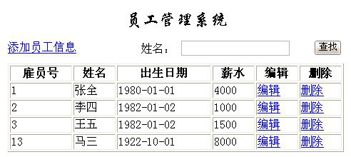 最后是我使用QueryRunner类和ResultHandler接口实现的一个简单的员工信息管理系统,可以实现基本的员工信息的增删改查操作,效果如下: