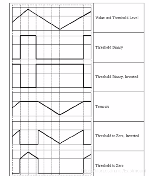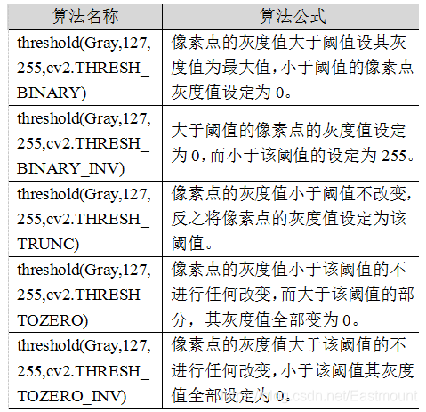 Python OpenCV中提供了阈值函数threshold()实现二值化处理,其公式及参数如下图所示:
