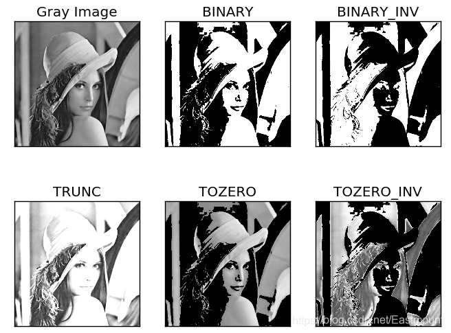 titles = ['Gray Image','BINARY','BINARY_INV','TRUNC','TOZERO','TOZERO_INV']