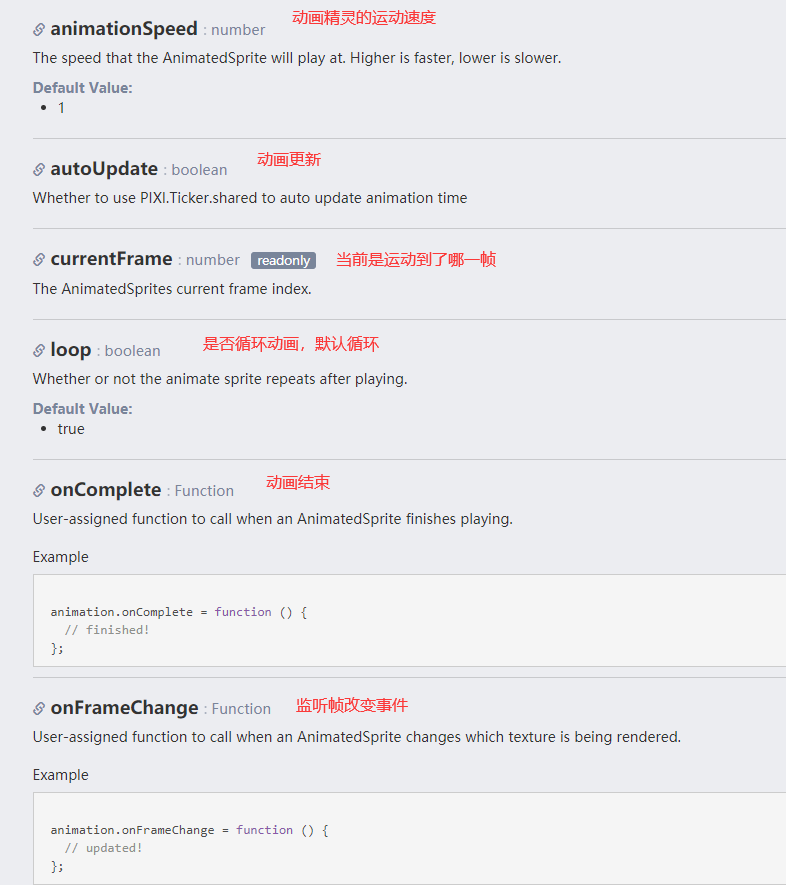 这里要介绍一下pixi.js的API中的内容,如何去判断精灵动画的结束和开始,正在运行当前动画的哪一帧。通过这样的方式去判断切换不同的动作