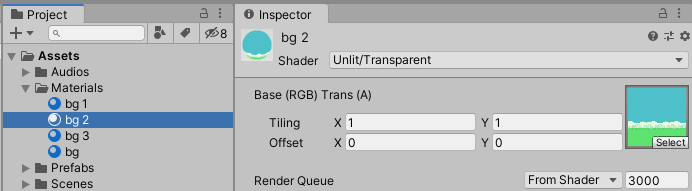 然后修改其名称为bg,修改其Shader为Unlit/Transparent: