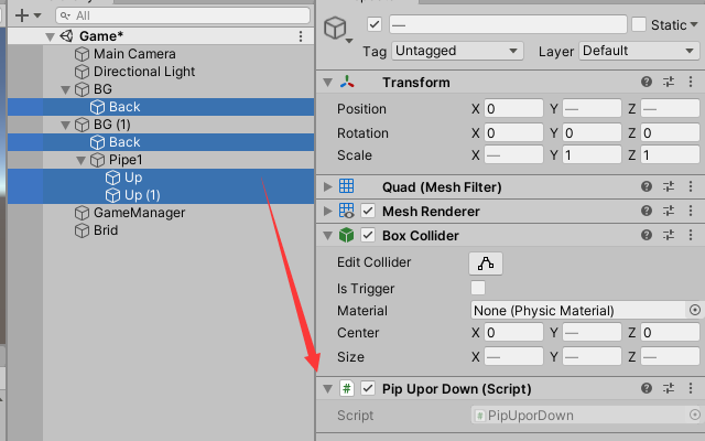 10.3 添加游戏接触检测,创建脚本PipUporDown,给上面添加碰撞体的几个游戏物体都挂载上,这样小鸟碰到柱子和底部就可以触发游戏结束了,脚本内容如下:
