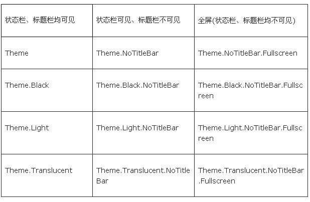 主题Theme就是用来设置界面UI风格,可以设置整个应用或者某个活动Activity的界面风格。在Android SDK中内置了下面的Theme,可以按标题栏Title Bar和状态栏Status Bar是否可见来分类: