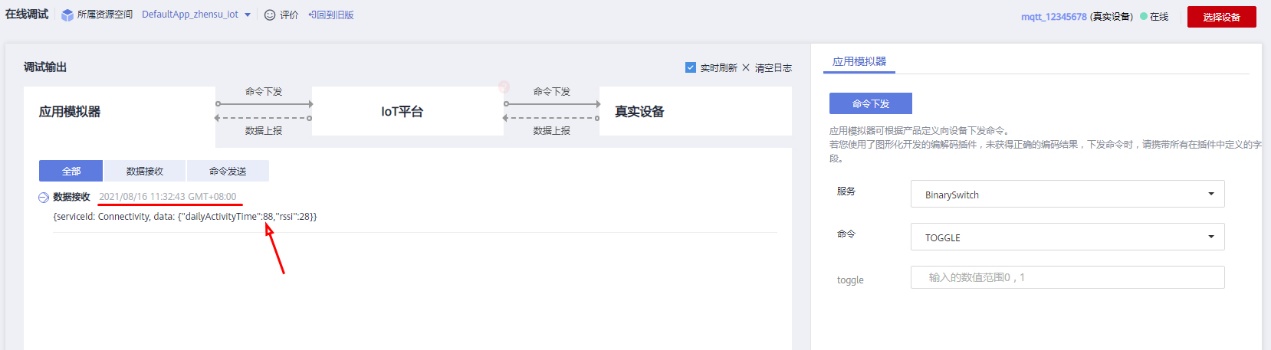( 1 )进入 华为云 API E xplorer 。 https://apiexplorer.developer.huaweicloud.com/apiexplorer/debug?product=IoTDA&api=CreateCommand ( 2 )选择 CreateCommand 下发设备命令。 ( 3 )填入设备 ID 等 参数。 参数 区写入 {"cmd_value":"hi2021 Cat.1 "} 。  ( 4 )点击 调试 。华为云页面 显示 调试 成功。  ( 5 ) PLC 尾端 STA 模组 的串口调试助手, 显示 收到 hi2021Cat.1 的 命令。 路径 是华为云,到Cat.1 模组 ,到 CCO 头端 ,经过 PLC 网络 ,到 STA 尾端 , 最终 从串口输出。   |