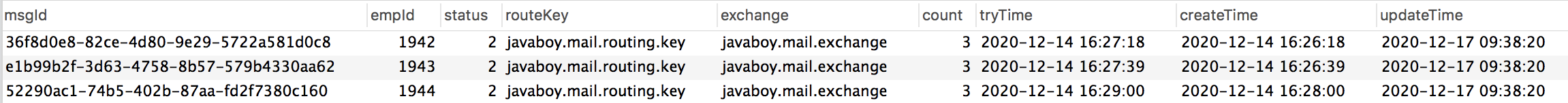 - 在消息发送的时候,我们就往该表中保存一条消息发送记录,并设置状态 status 为 0,tryTime 为 1 分钟之后。