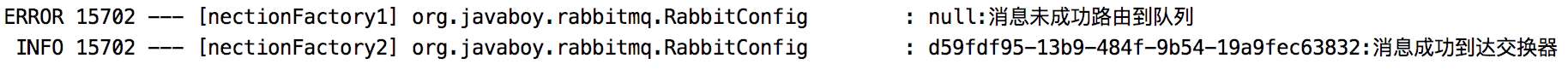 public class RabbitConfig implements RabbitTemplate.ConfirmCallback, RabbitTemplate.ReturnsCallback { public static final String JAVABOY_EXCHANGE_NAME = "javaboy_exchange_name"; public static final String JAVABOY_QUEUE_NAME = "javaboy_queue_name"; private static final Logger logger = LoggerFactory.getLogger(RabbitConfig.class); @Autowired RabbitTemplate rabbitTemplate; @Bean Queue queue() { return new Queue(JAVABOY_QUEUE_NAME); } @Bean DirectExchange directExchange() { return new DirectExchange(JAVABOY_EXCHANGE_NAME); } @Bean Binding binding() { return BindingBuilder.bind(queue()) .to(directExchange()) .with(JAVABOY_QUEUE_NAME); } @PostConstruct public void initRabbitTemplate() { rabbitTemplate.setConfirmCallback(this); rabbitTemplate.setReturnsCallback(this); } @Override public void confirm(CorrelationData correlationData, boolean ack, String cause) { if (ack) { logger.info("{}:消息成功到达交换器",correlationData.getId()); }else{ logger.error("{}:消息发送失败", correlationData.getId()); } } @Override public void returnedMessage(ReturnedMessage returned) { logger.error("{}:消息未成功路由到队列",returned.getMessage().getMessageProperties().getMessageId()); }