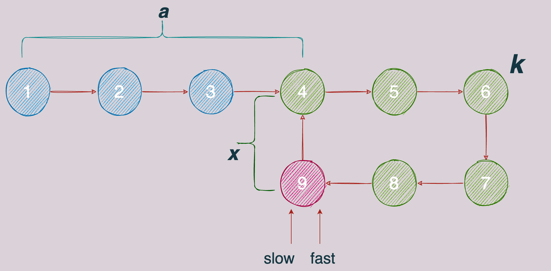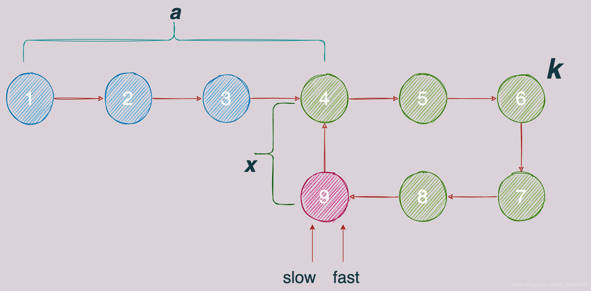即慢指针再走x步就到达环的入口,此时slow走过的距离