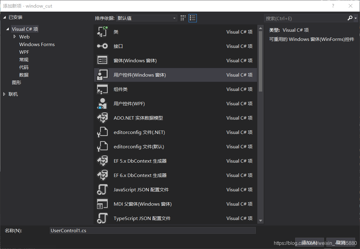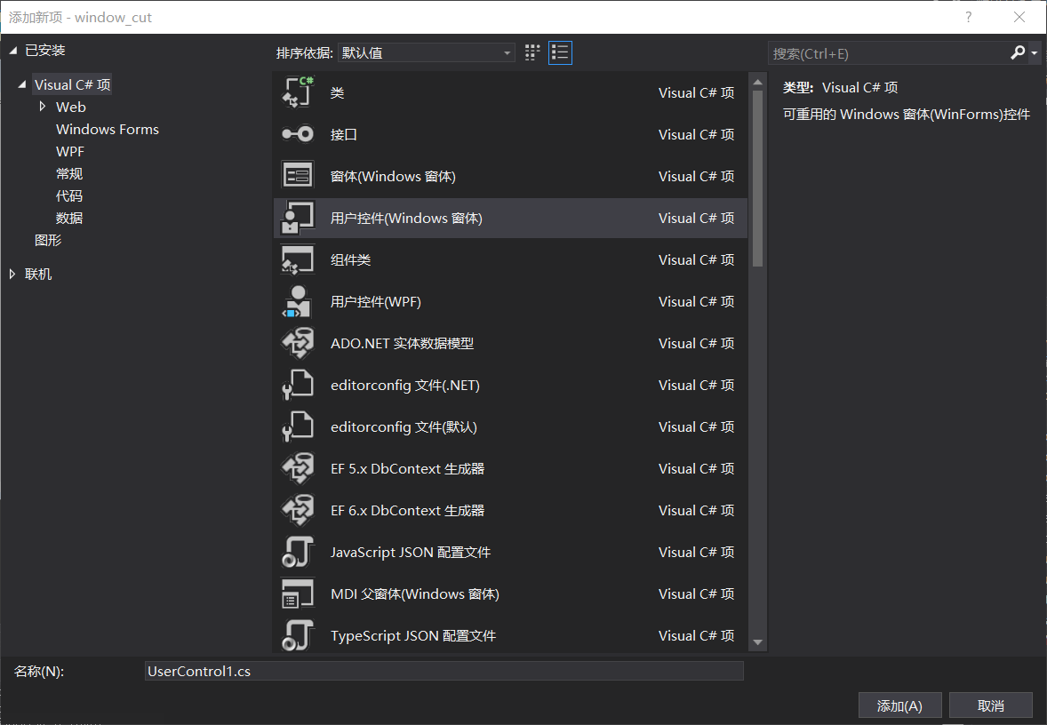 2、新建用于在主窗体中显示的子窗体,子窗体的新建其实是一个用户控件(Windows窗体),在这里我们可以在状态栏中右击选择—>添加—>用户控件(Windows窗体)