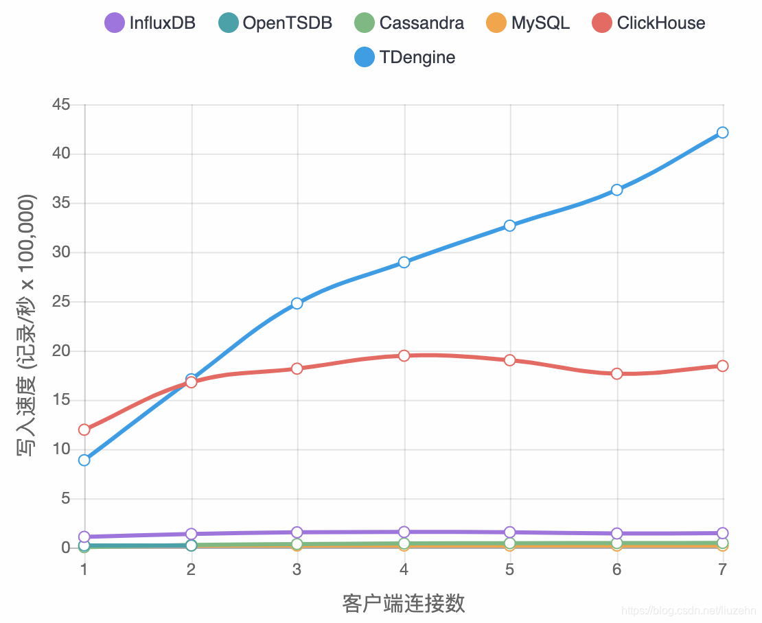 由上图结果,我们可以知道 TDengine 的写入速度远远高于 MySQL, Cassandra, InfluxDB, OpenTSDB等工具,和 ClickHouse 在客户端连接数为1或2时,不相上下,但是随着客户端连接数的增加写入速度开始甩开 ClickHouse。