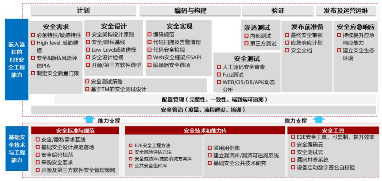 - 华为在践行DevOps时,有一套贯穿研发过程的安全保障体系,从计划阶段、编码与构建阶段、验证阶段、发布与运营阶段嵌入了多个安全工程能力,包括安全需求、安全设计、安全实现、安全测试及安全事件响应,通过一系列的安全管制,也逐步完善了自己的安全标准,安全技术和能力库,并且衍生了更多的安全工具来实现更高的安全指令