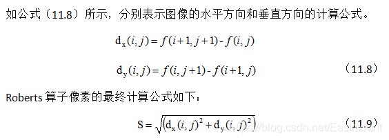 Roberts算子的模板分为水平方向和垂直方向,如公式(11.7)所示,从其模板可以看出,Roberts算子能较好的增强正负45度的图像边缘。