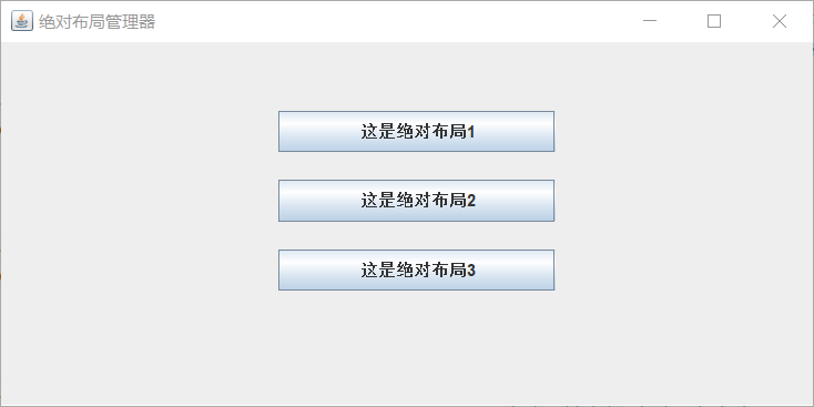 除了网格布局管理器、流布局管理器、边界布局管理器这三种布局方式以外,还有一种较为不同的布局方式就是绝对布局,所谓绝对布局,就是按照一定的坐标数据将组件的坐标和大小硬性的设置在窗体上。