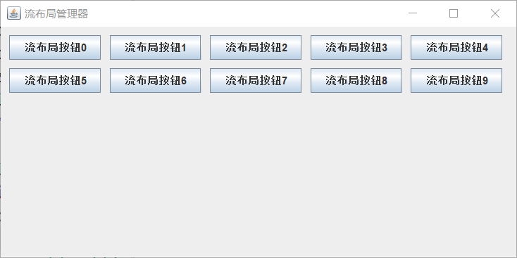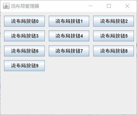 在我们拉动窗体大小变化时,其中的组件也会按照流布局的特点发生改变,这就验证了流布局管理器中的组件按照从左到右的顺序依次摆放,直到该行占满后再从下一行开始摆放。