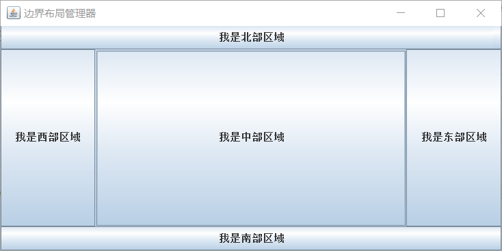 关于边界布局管理器的具体使用可以参考如下实例,将容器划分为东、南、西、北、中五个区域,并在各区域中添加组件。