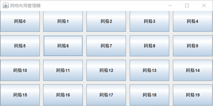 将容器设置为4行5列的网格,网格之间的水平和垂直间距为10像素。并在其中加入20个按钮