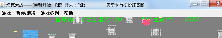 菜单功能包括游戏的重新开始,暂停,退出等。这些功能的用户界面放在了TankClient的构造方法里,用到的是面板类和相应的监听功能,实现出来很简单。