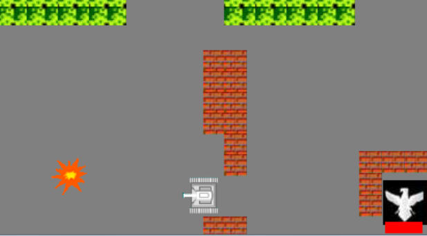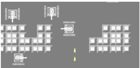 6. 墙:墙体分为两种,普通的墙和铁墙,普通的墙在受到子弹袭击时会损坏,而铁墙可以阻碍子弹的穿越。两方的坦克均不能穿越两种墙体,但都可以摧毁普通墙体。普通墙体的数目配合其他元素合理安排,铁墙则不宜过多,不然游戏难度太低甚至因为坦克不能穿越铁墙而使得游戏无法进行下去。