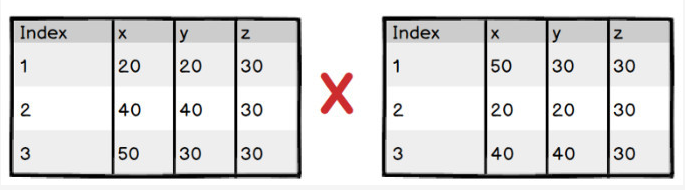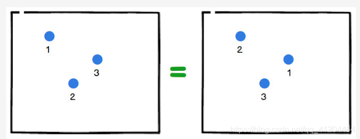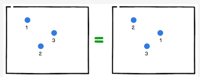 左边有三个点云,右边也有三个点云,虽然每个点的索引值不一样,但是它们的分布、形状等都是一样的;在分类或分割模型,对左、右两幅图应该输出同一个结果(看起像三角形)。