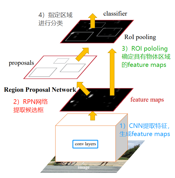 - CNN提取特征,生成特征图feature maps。共享基础卷积层,用于提取整张图片的特征。例如VGG16,去除其中的全连接层,只留下卷积层,输出下采样后的feature maps。该feature maps被共享用于后续RPN层和全连接层。