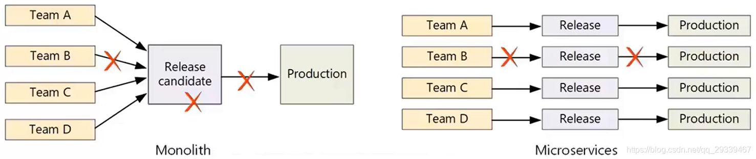 - 如下图,传统应用程序,需要等到合并、测试完成后才能进行部署;而微服务中 “A” 可以随时发布更新,无需等待 “B‘