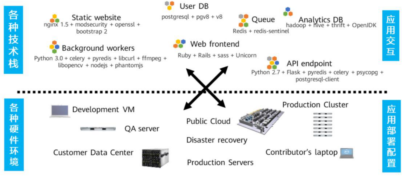 - 开发完软件/工程后,我们要进行部署,部署的时候就面临着高度分散和异构化的部署环境