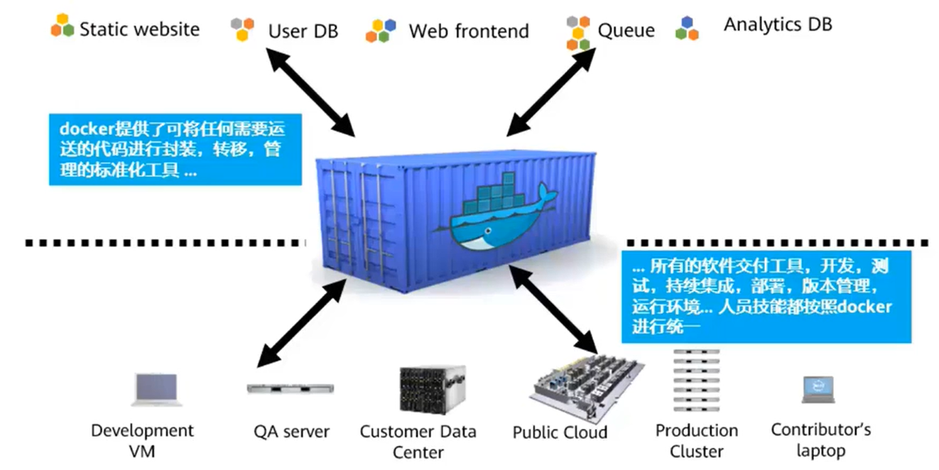 - docker 是容器技术的一种,它是将任何需要运送的代码进行封装、转移、管理的标准化工具,所有的软件交付工具、开发、测试、持续集成、部署、版本管理、运行环境都按照 docker 进行统一