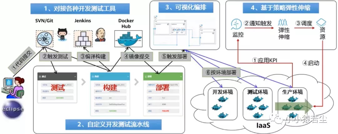 - 首先开发人员使用 git/svn 工具开发以及提交代码,触发测试和 Jenkins 编译构建(这里的测试通常是对于代码的测试,白盒测试)
