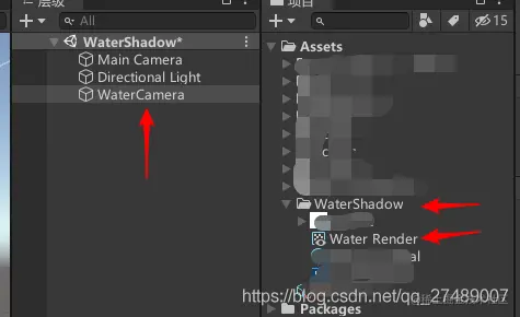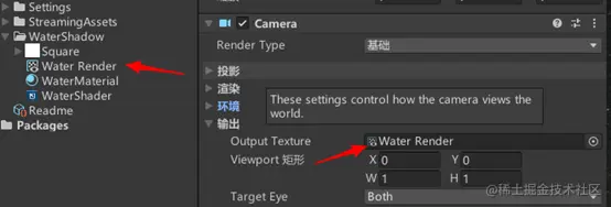 重点——指定WaterCamera的Output Texture为刚才创建的Water Render。原理:将相机摄入的内容渲染到Water Render中,将这个Render借住其他组件在场景中展示出来即可。