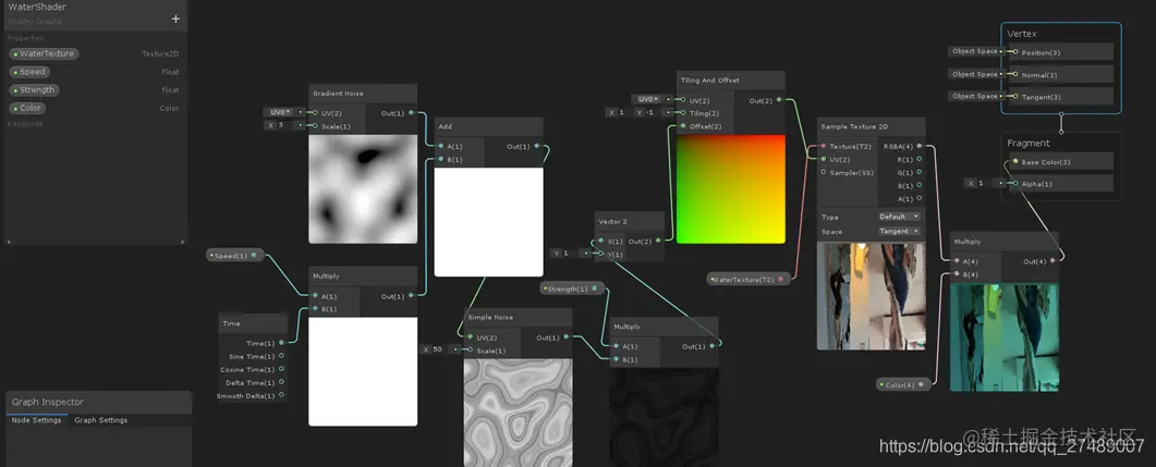 这种效果我们还并不满足,我们要继续往下优化,将内容翻转,所有需要创建Tiling And Offset翻转节点。