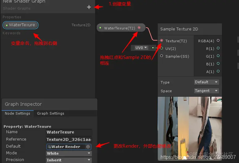 为了在外部能够随时更改里面的内容,我们先创建一个Texture2D变量,然后将变量拖拽到舞台中,接着创建一个Sample Texture 2D节点,最后将变量节点指向此节点的Texture