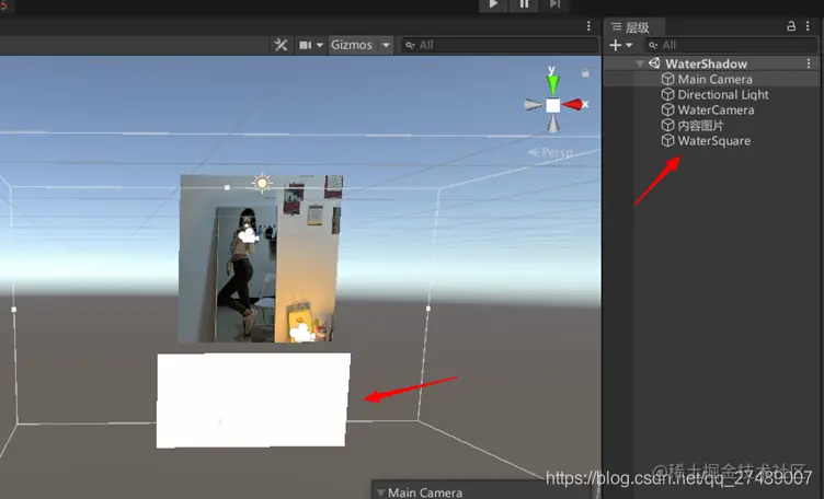 在场景中创建一个Camera(相机),改名为WaterCamera,相机属性和Main Camera(主相机)相同,不同的是摄像的内容是你想要映射的内容。稍微自己调下位置即可。