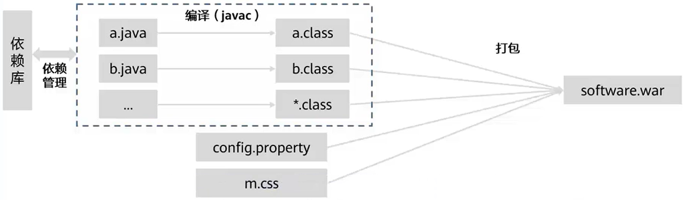 编译构建是指把软件的源代码编译成目标文件,并把配置文件和资源文件等打包的过程输入是源代码文件、库文件、配置文件、资源文件等输出是软件包:一个可以直接部署的软件,或者是一个可以被其他软件使用的 lib编译器完成编译过程,编译管理(构建)工具完成“构建”过程- 下图为一个 JavaWeb 程序,我们编写的