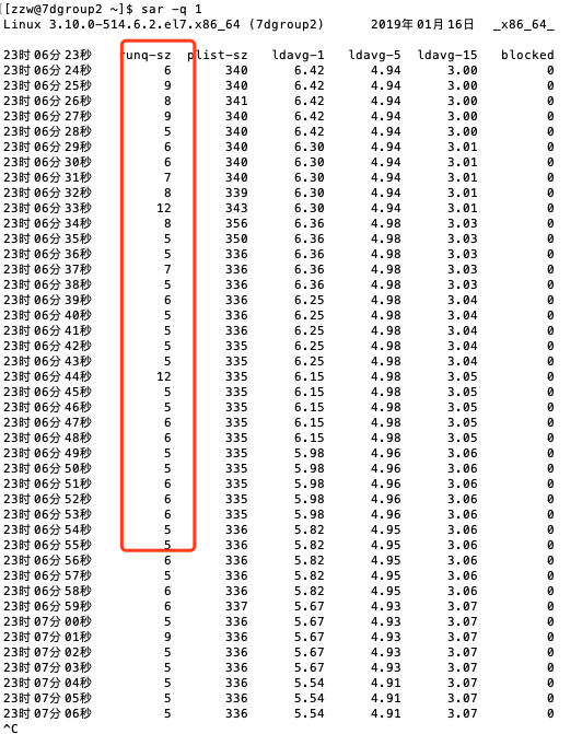 进一步查看运行队列的长度(等待运行的进程数),可以看出,stress 进程们在疯狂的争夺 2 个CPU,这就导致出现运行队列过大,这些超出 CPU 计算能力的进程,最终导致系统过载。