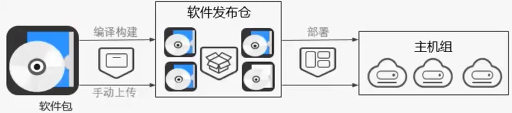 云主机部署:用户通过手动上传、或者编译构建任务,将软件包保存在软件发布库内;部署任务将软件包上传并安装到云主机中