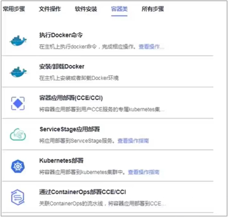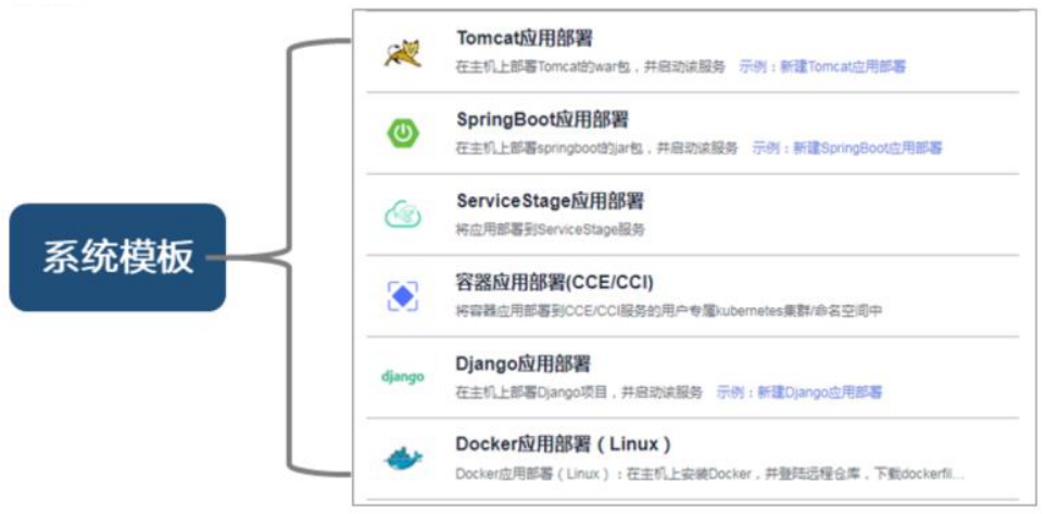 - 使用系统模板快速创建部署任务:通过 Springboot、Tomcat、CCE 容器应用部署、Docker 应用部署等系统模板快速创建部署任务