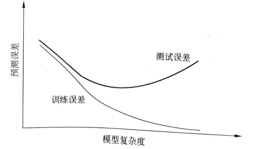 下图描述了训练误差和测试误差与模型的复杂度之间的关系。当模型的复杂度增大时,训练误差会逐渐减小并趋向于0;而测试误差会先减小,达到最小值后又增大。当选择的模型复杂度过大时,过拟合现象就会发生。正则化与交叉验证是防止过拟合的两种方法。