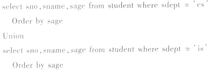 ②各查询语句中每个列的数据类型必须与其他查询中对应列的数据类型是隐式兼容的,即只要它们能进行隐式转换即可。例如,如果第一个查询中第二个列的数据类型是char(20),而第二个查询中第二个列的数据类型是varchar(40)是可以的。