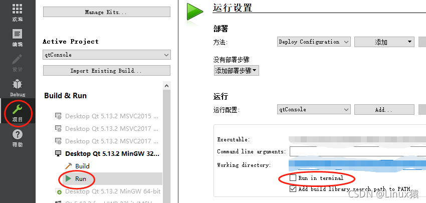 在 Qt 中开发程序,默认情况下使用的是集成的终端,那么,如果想要弹出控制台终端怎么办呢?执行步骤如下: