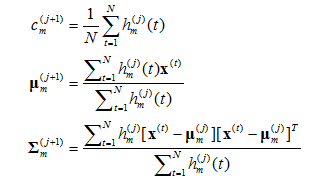在得到混合高斯模型的形式后,需要估计混合高斯模型的一系列参数变量:=,我们主要采用最大期望值算法(Expectation Maximization, EM)进行参数估计,公式如下: