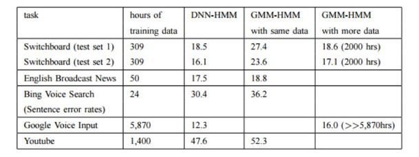 相比于GMM模型,DNN模型具有一些明显的优势:首先,DNN是一种判别模型,自身便带有区分性,可以更好区分标注类别;其次,DNN在大数据上有非常优异的表现,伴随着数据量的不断增加,GMM模型在2000小时左右便会出现性能的饱和,而DNN模型在数据量增加到1万小时以上时还能有性能的提升;另外,DNN模型有更强的对环境噪声的鲁棒性,通过加噪训练等方式,DNN模型在复杂环境下的识别性能甚至可以超过使用语音增强算法处理的GMM模型。