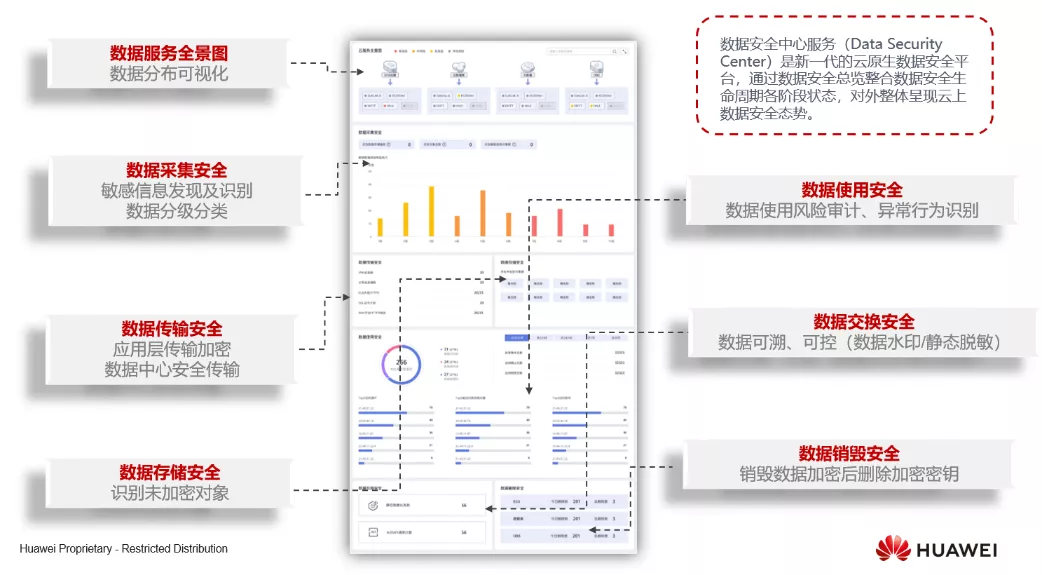DSC展示数据安全全生命周期各个阶段的状态,提供云服务全景图、数据采集安全、数据传输/存储安全、数据使用安全和数据交换/删除安全共5大板块,实时呈现数据安全整体态势,围绕数据安全全生命周期为客户提供一站式的可视、可控、可溯的数据安全解决方案。