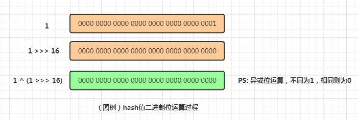 示例中,当key为1时,其hashCode值为1,源码(h = key.hashCode()) ^ (h >>> 16) 对应实现为 1 ^ ( 1 >>> 16)
