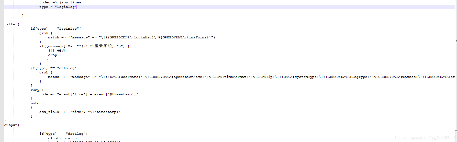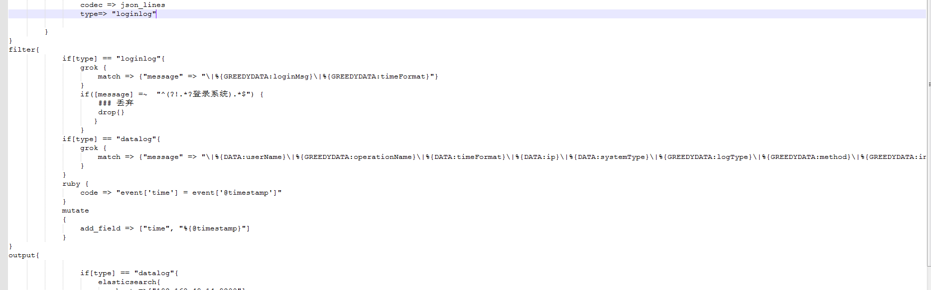match => {"message" => "\|%{DATA:userName}\|%{GREEDYDATA:operationName}\|%{DATA:timeFormat}\|%{DATA:ip}\|%{DATA:systemType}\|%{GREEDYDATA:logType}\|%{GREEDYDATA:method}\|%{GREEDYDATA:input}"}