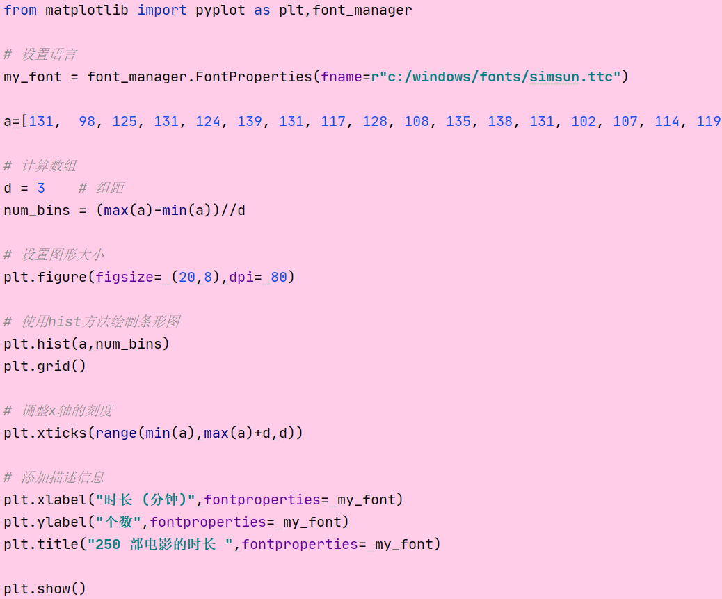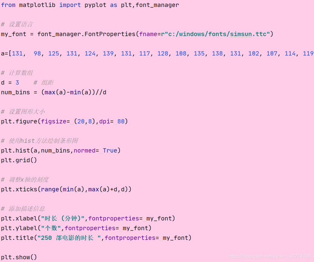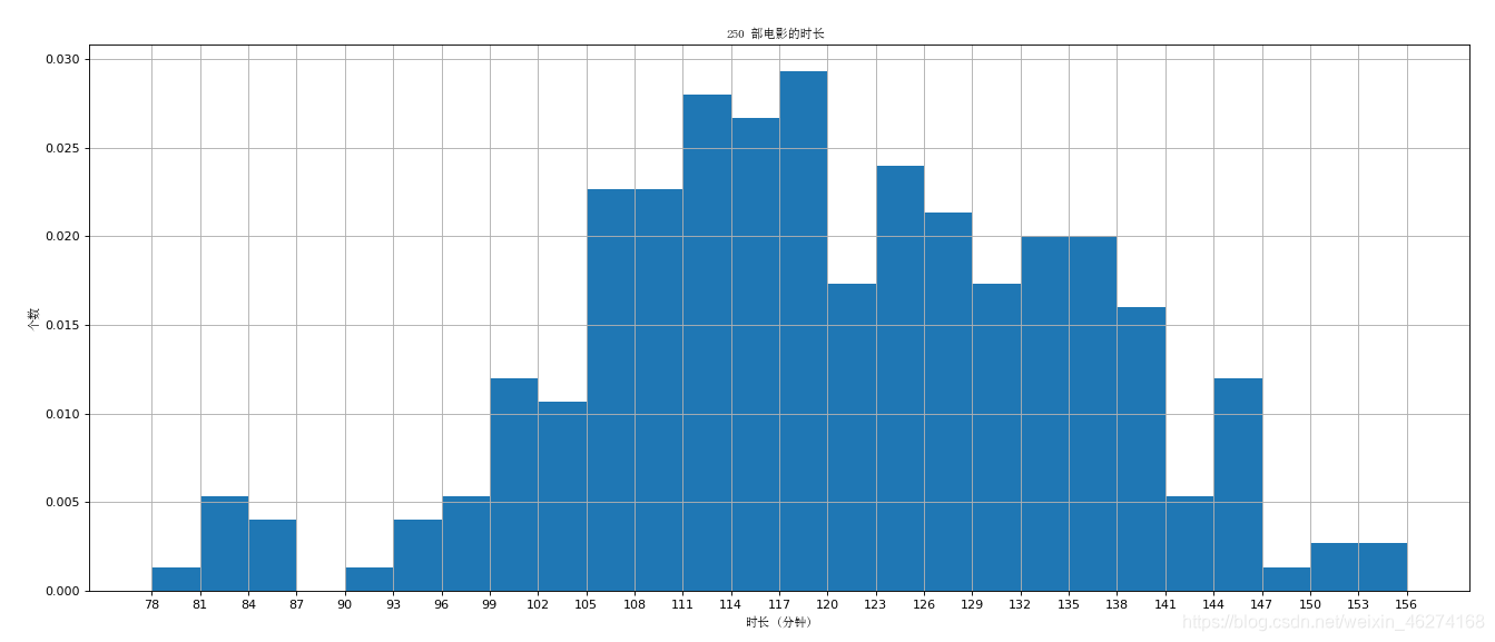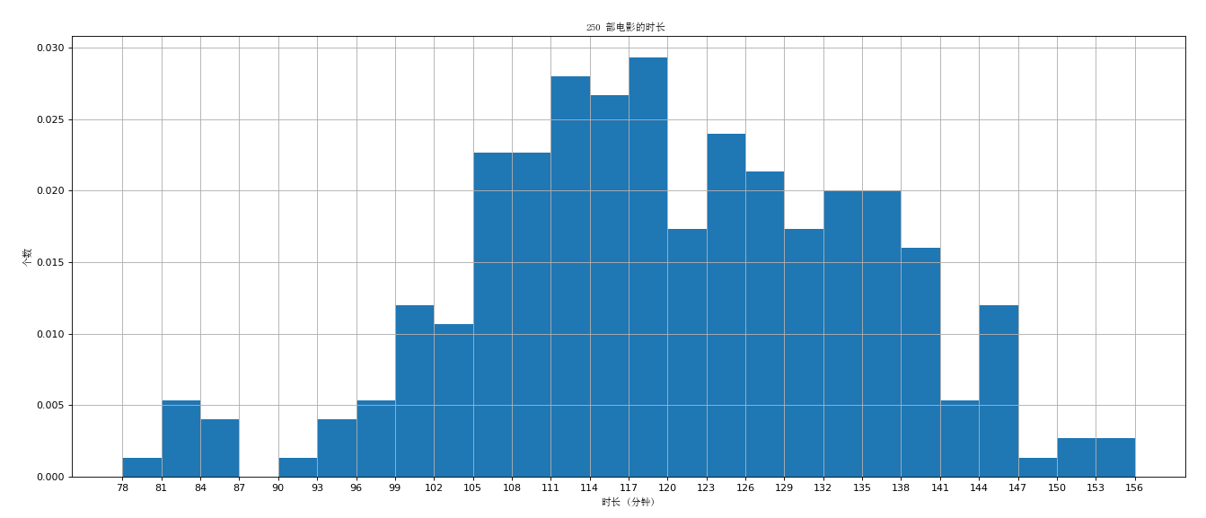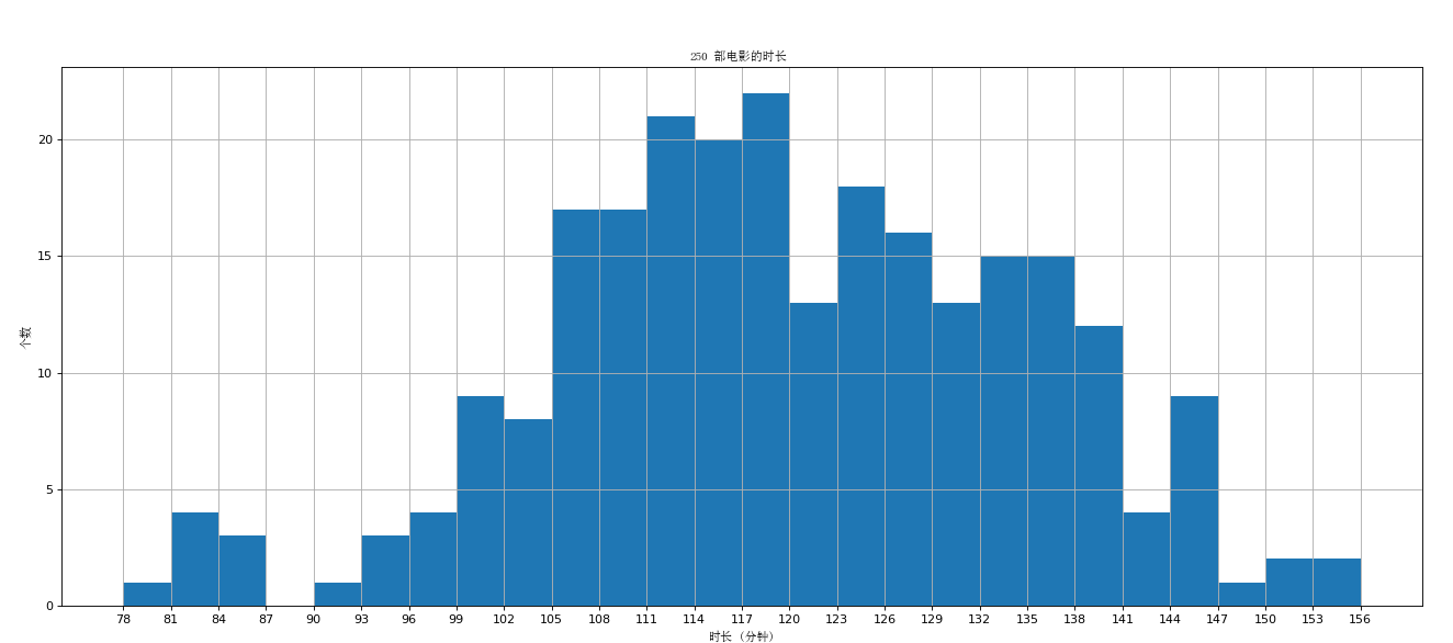 假设你获取了 250 部电影的时长 ( 列表a 中 ), 希望统计出这些电影时长分布状态 ( 比如时长为 100 分钟到 120 分钟电影的数量, 出现的频率 ) 等信息, 你应该如何呈现这些数据?