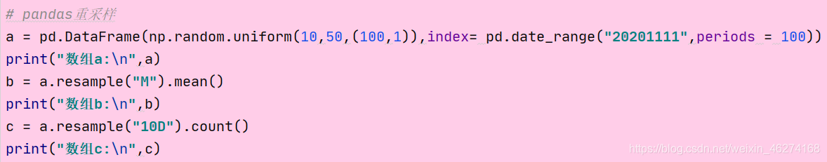 重采样: 指的是将时间序列从一个频率转化为另一个频率进行处理的过程, 将高频率数据数据转化为低频数据为降采样, 低频转化为高频率为升采样.