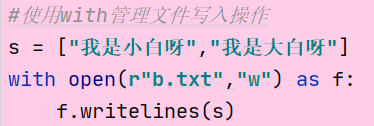 with 关键字 ( 上下文管理器 ) 可以自动管理上下文资源, 不论什么原因跳出 with 块, 都能确保文件正确关闭, 并且可以在代码块执行完毕后自动还原进入该代码块时的现场.