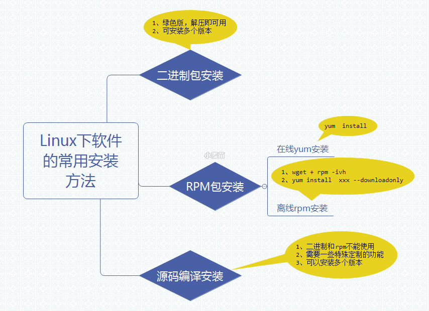 PG安装方法很多,和MySQL类似,给用户提供很大的选择空间。如:RPM包安装(在线、离线)、源码编译安装、二进制等。