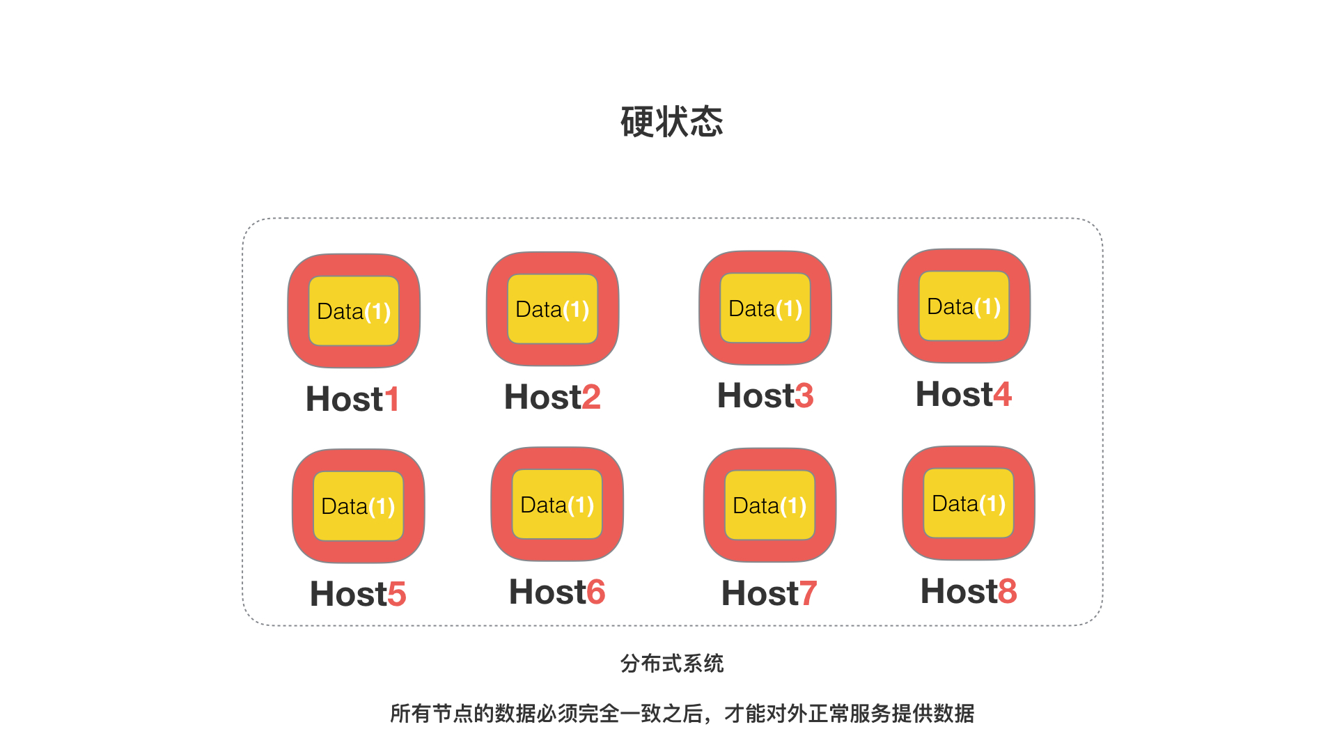 - 原子性(硬状态) -> 要求多个节点的数据副本都是一致的,这是一种"硬状态"