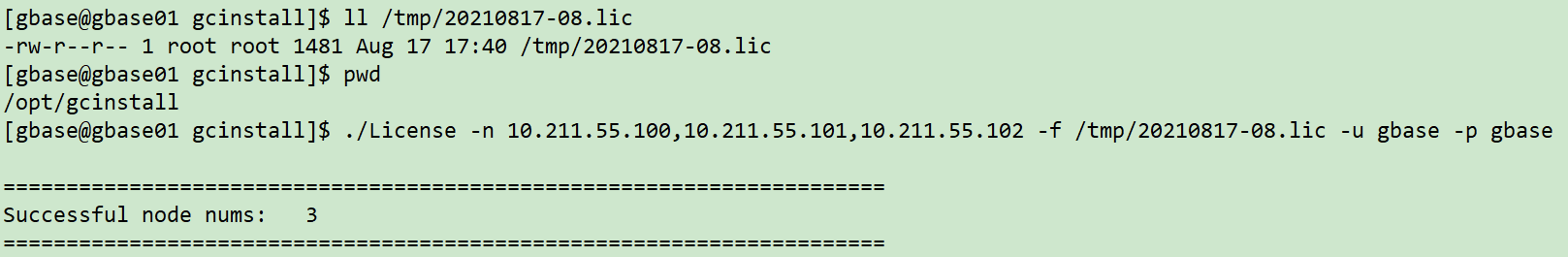 ./License -n 10.211.55.100,10.211.55.101,10.211.55.102 -f /tmp/20210817-08.lic -u gbase -p gbase