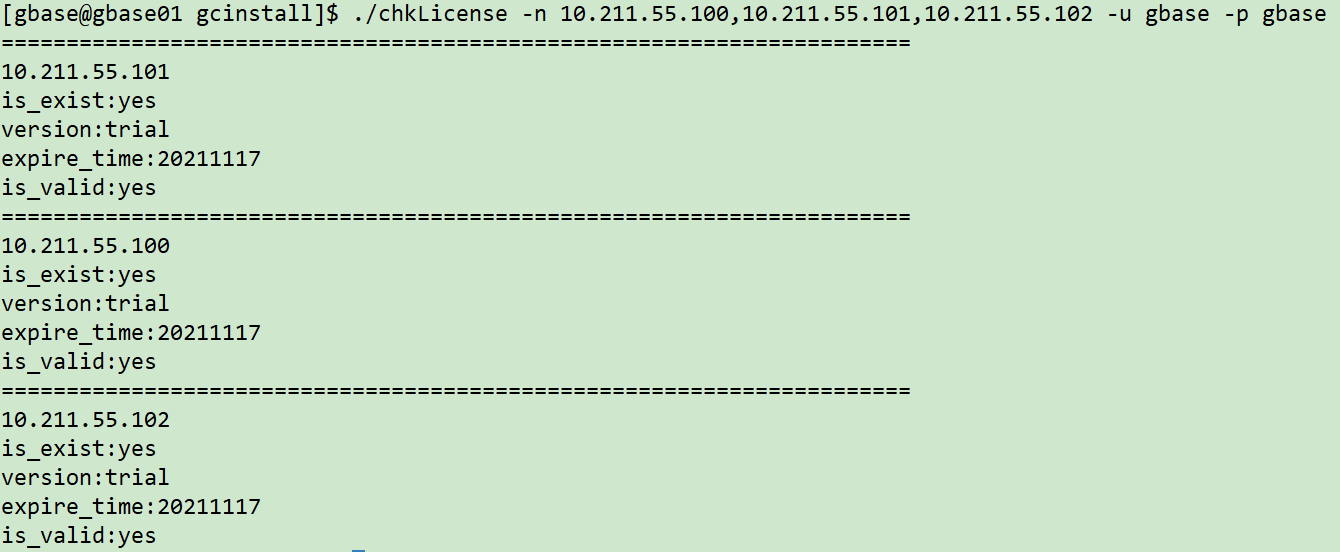 ./chkLicense -n 10.211.55.100,10.211.55.101,10.211.55.102 -u gbase -p gbase